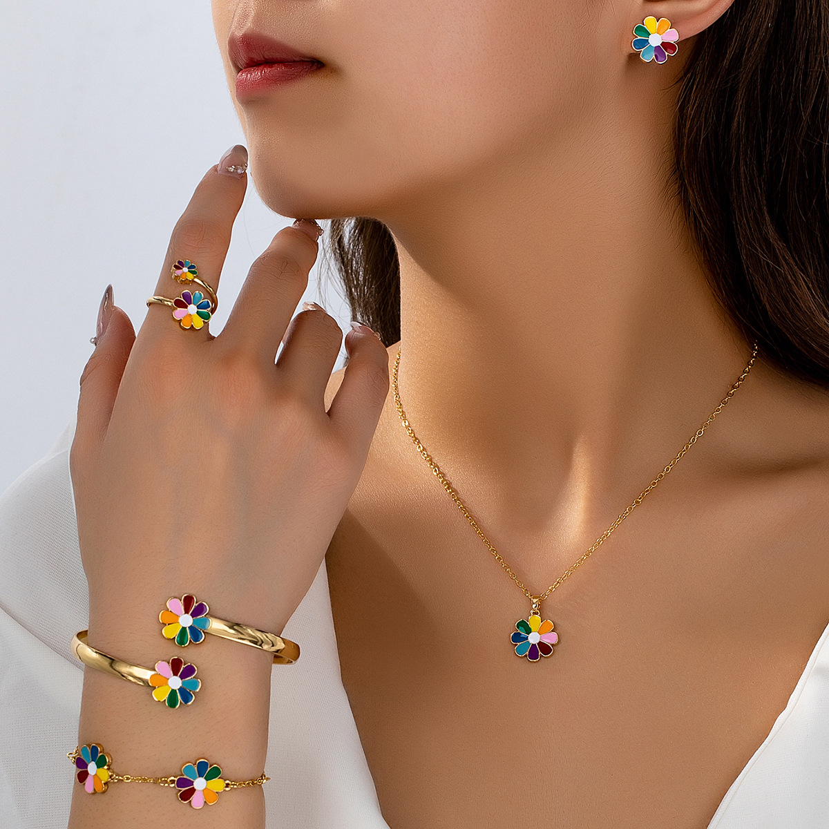 Cross-Border New Product Sweet and Cute Preppy Style Colorful Oil Dripping Petal Design Jewelry Set 5-Piece Charm Jewelry Set