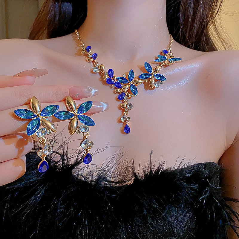 Europe and the United States new earrings necklace suit women alloy diamond full diamond flower jewelry Europe and the United States exaggerated sweater chain wholesale