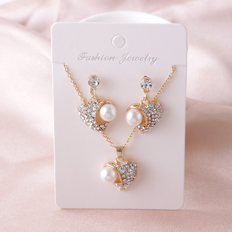 European and American style peach heart pearl jewelry set decoration diamond necklace earrings two-piece set manufacturer supply