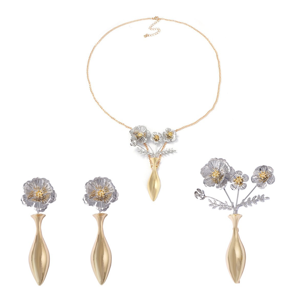 Za Cross-Border Retro Palace Style Stylish Alloy Vase Flower Pendant Necklace Earrings Brooch Set for Women