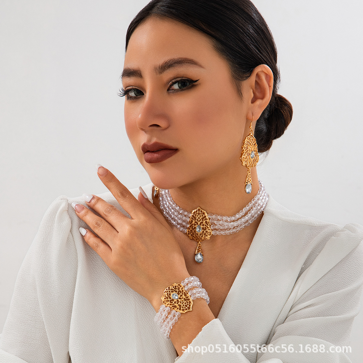 European and American Cross-Border Necklaces, Earrings, Hand Accessories, Three-Piece High-End Retro Palace Style Necklaces, Imitation Crystal Women's Jewelry Sets