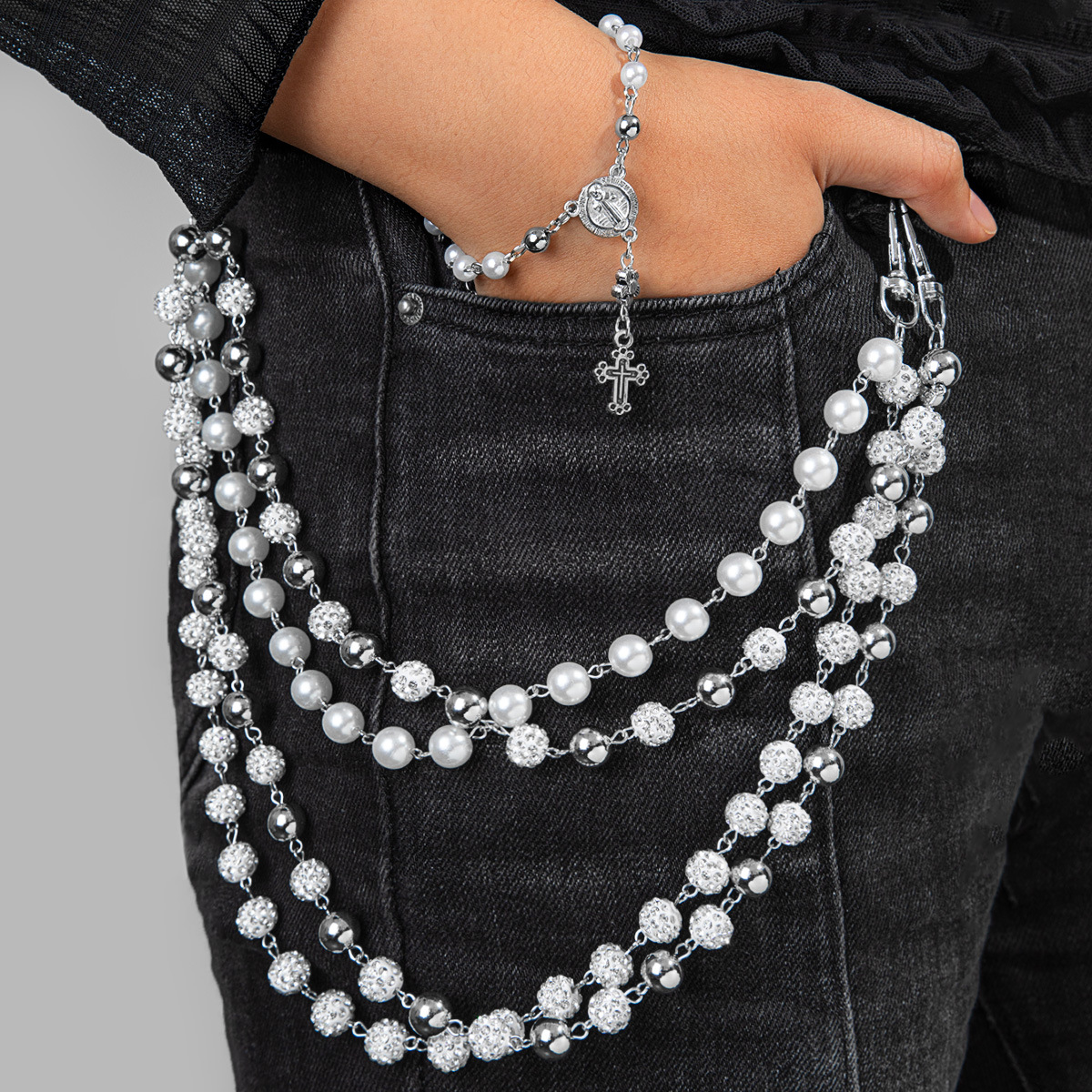 European and American Cross-Border Punk Hip-Hop Style Imitation Pearl Soft Clay Stacked Waist Pendant Cross Bracelet Set Decoration