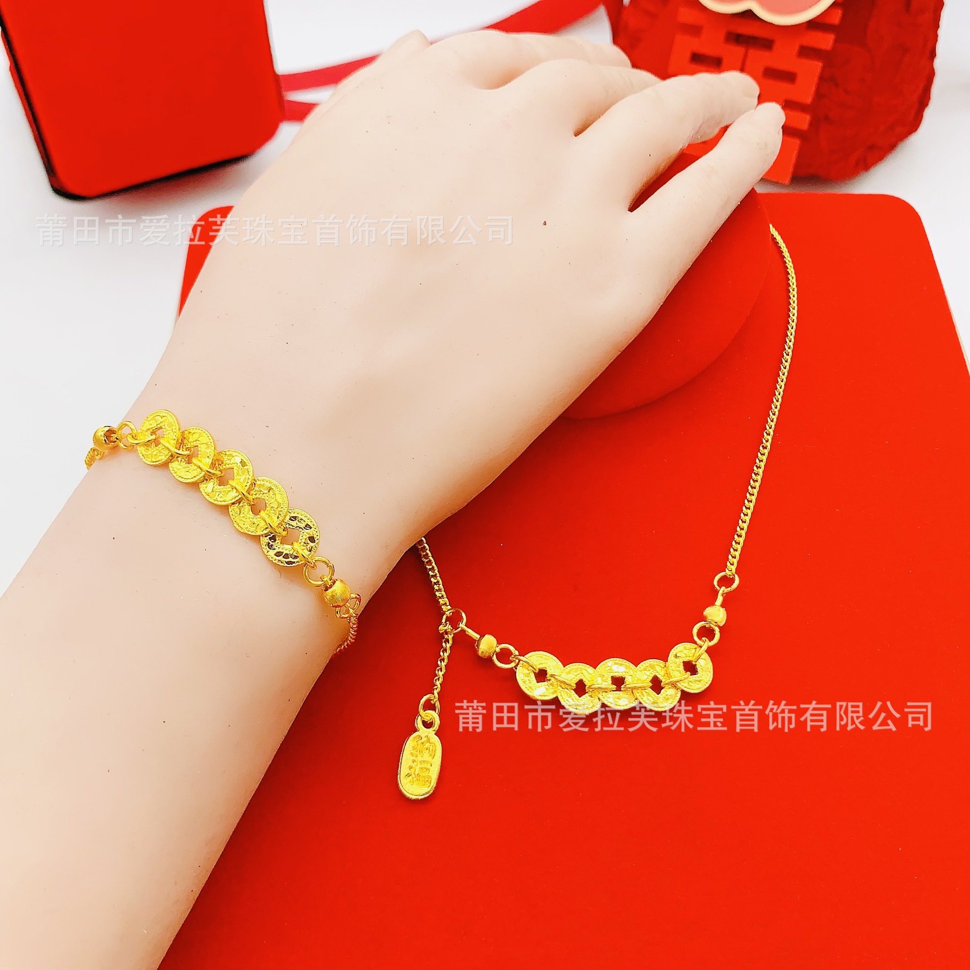 New Chinese Style Qian Duoduo Sparkling Crushed Ice Five Emperors Coin Clavicle Women's Necklace Versatile Bracelet Set Wholesale