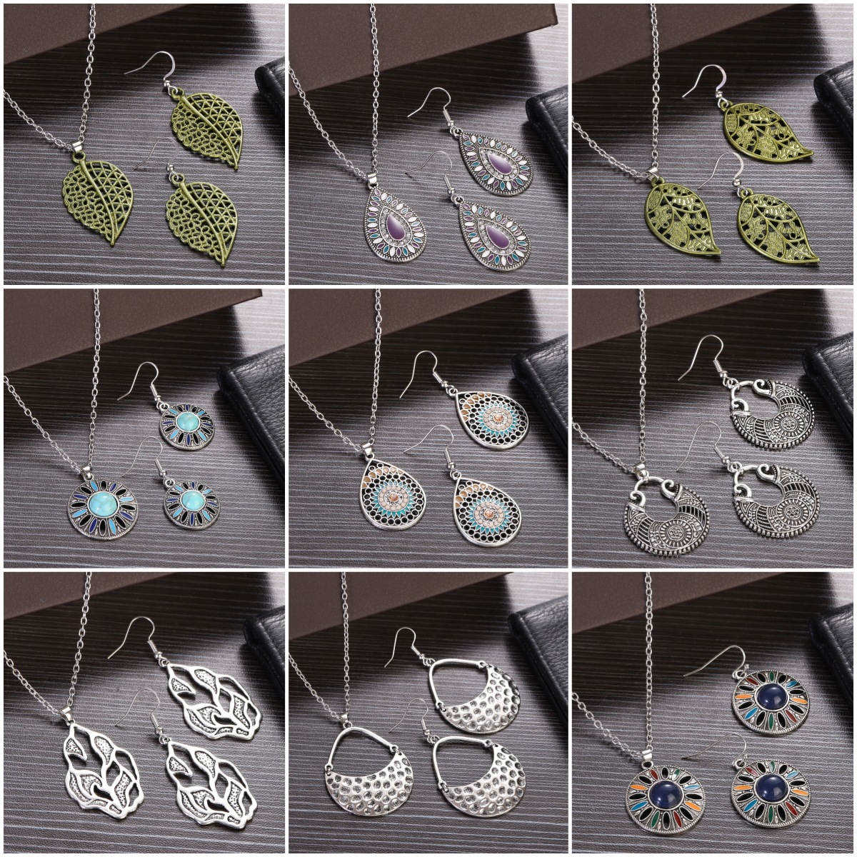 European and American new retro bohemian style leaf geometric alloy earrings necklace three-piece fashion suit