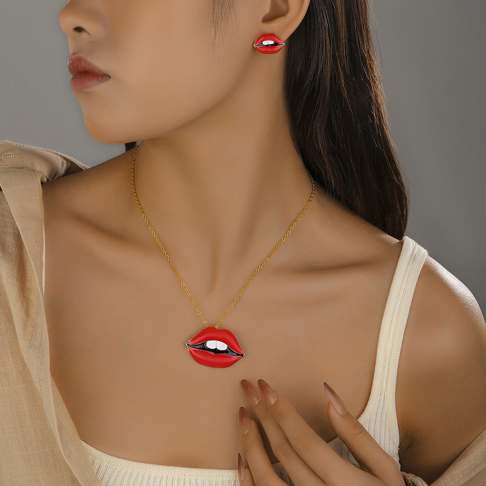 Little Mouth Red Lips Red Oil Dripping Pendant Necklace Earrings Set Gold Body Jewelry Set Clavicle Chain