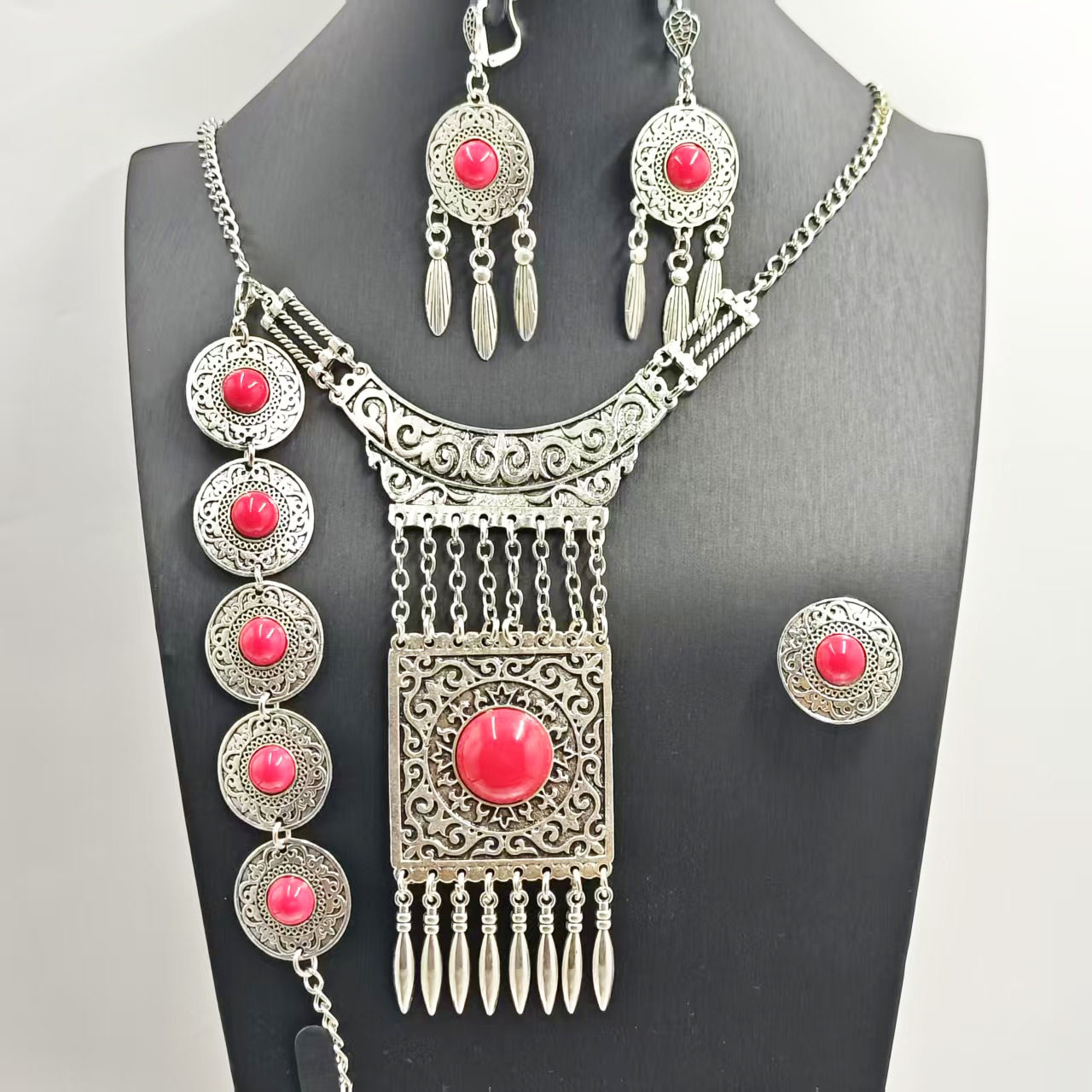 European and American Ethnic Style Four-Piece Tassel Retro Exotic Bohemian Holiday Bracelet Earrings Necklace Set for Women
