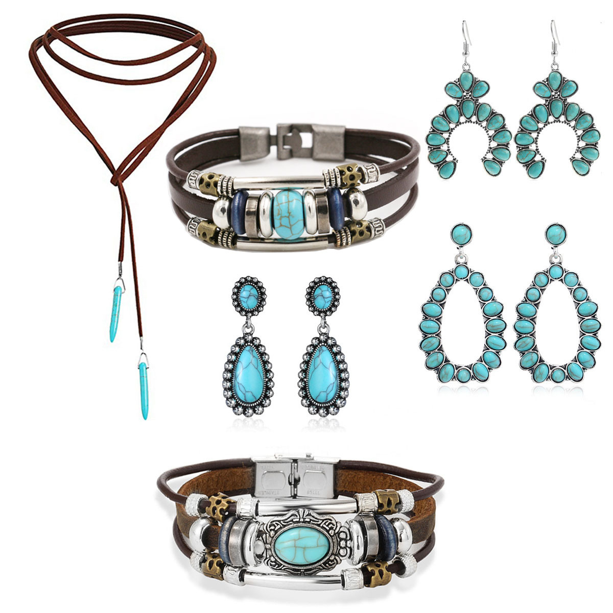 European and American Cross-border Retro Bohemian Turquoise Earrings Bracelet Necklace Amazon Hot Jewelry suit Women