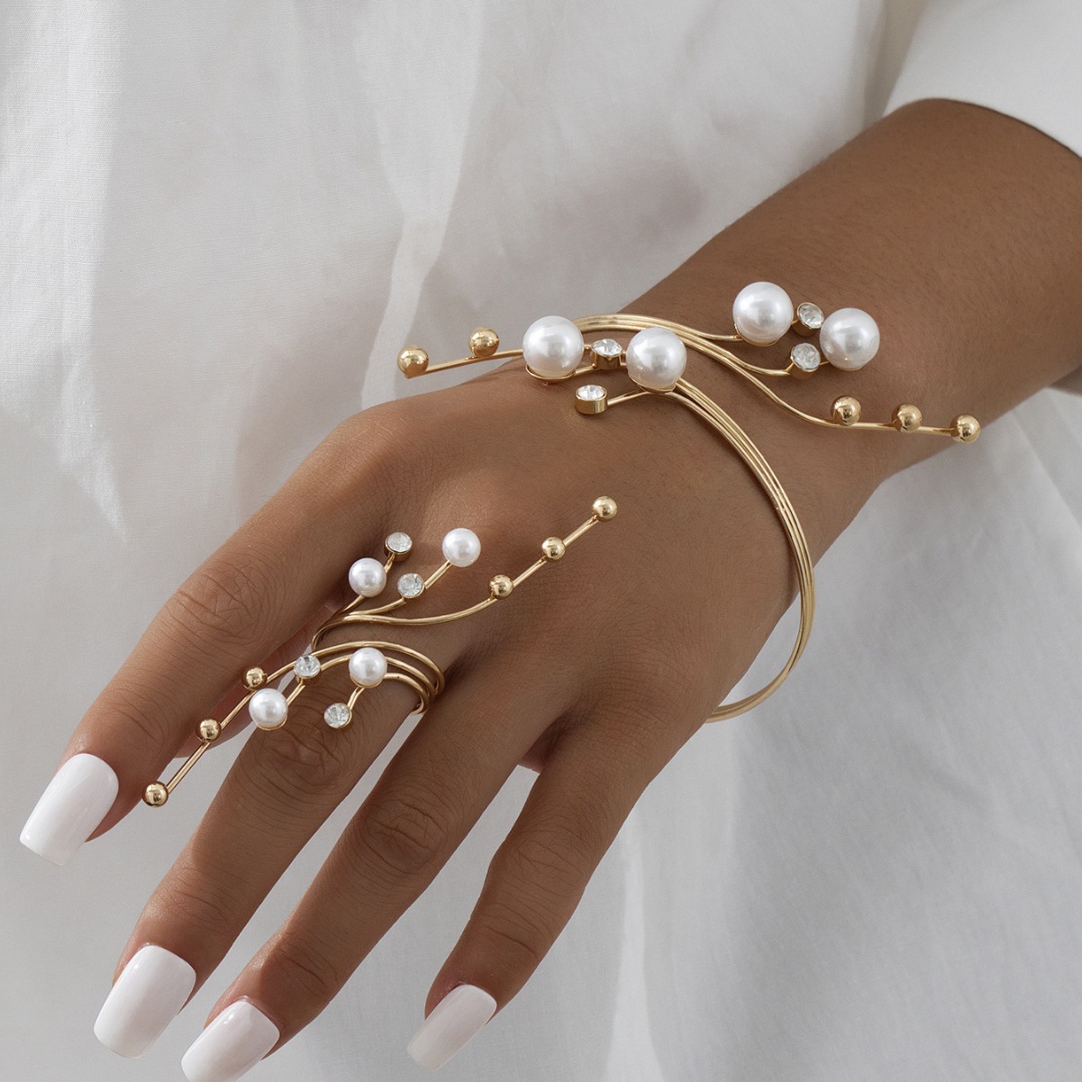Set of Exaggerated Vintage Pearl and Diamond Pattern Opening Adjustable Bracelet Ring Women Jewelry suit Gift