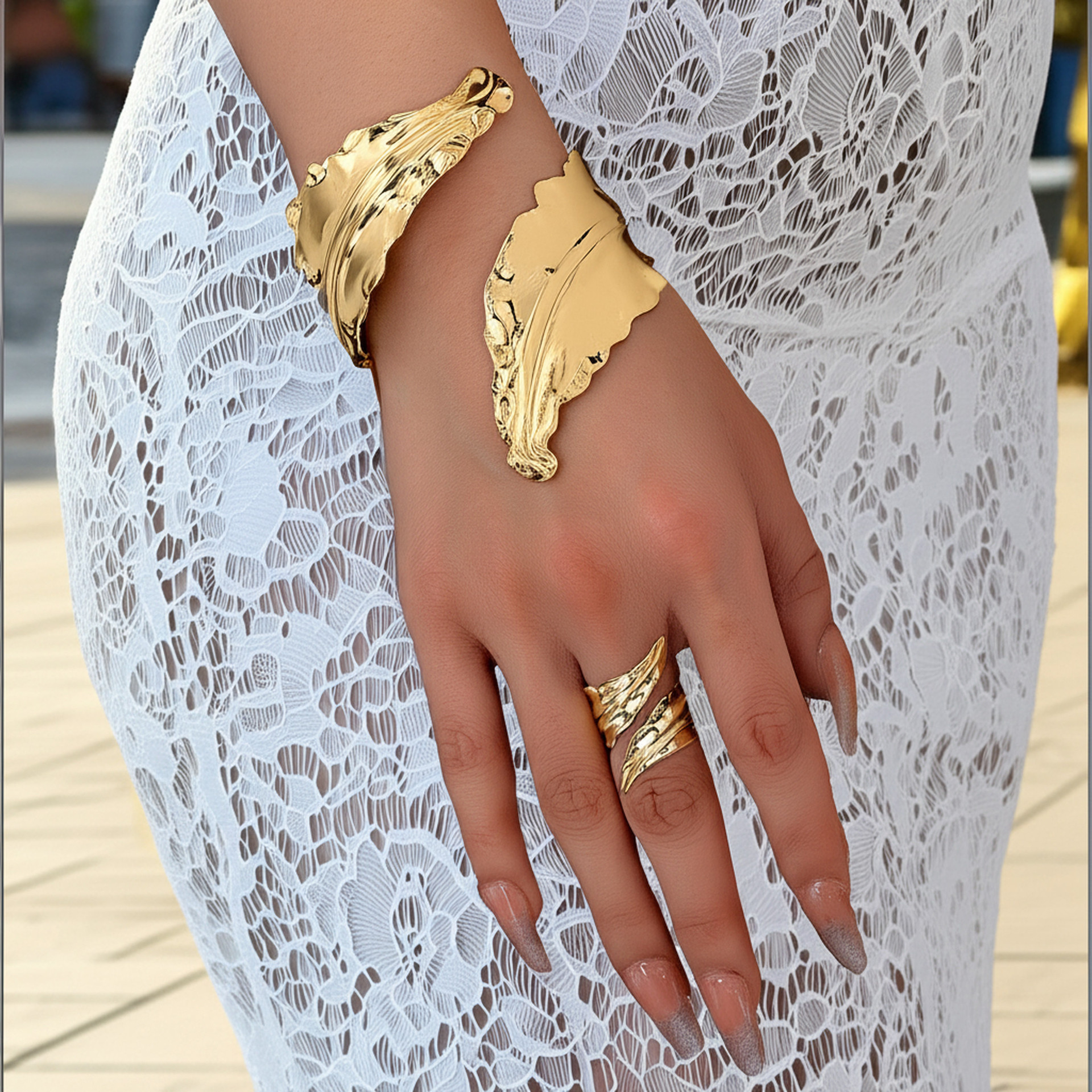 European and American Cross-Border Personalized Fashion Trend Leaf Open Bracelet Ring Two-Piece Set Suitable for Women's Party Street Wear