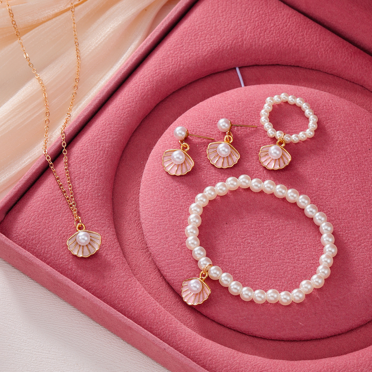 Korean and Japanese Style Pearl Shell Oil Drop Pendant Summer New Light Luxury Necklace Ring Bracelet Earrings Four-Piece Set