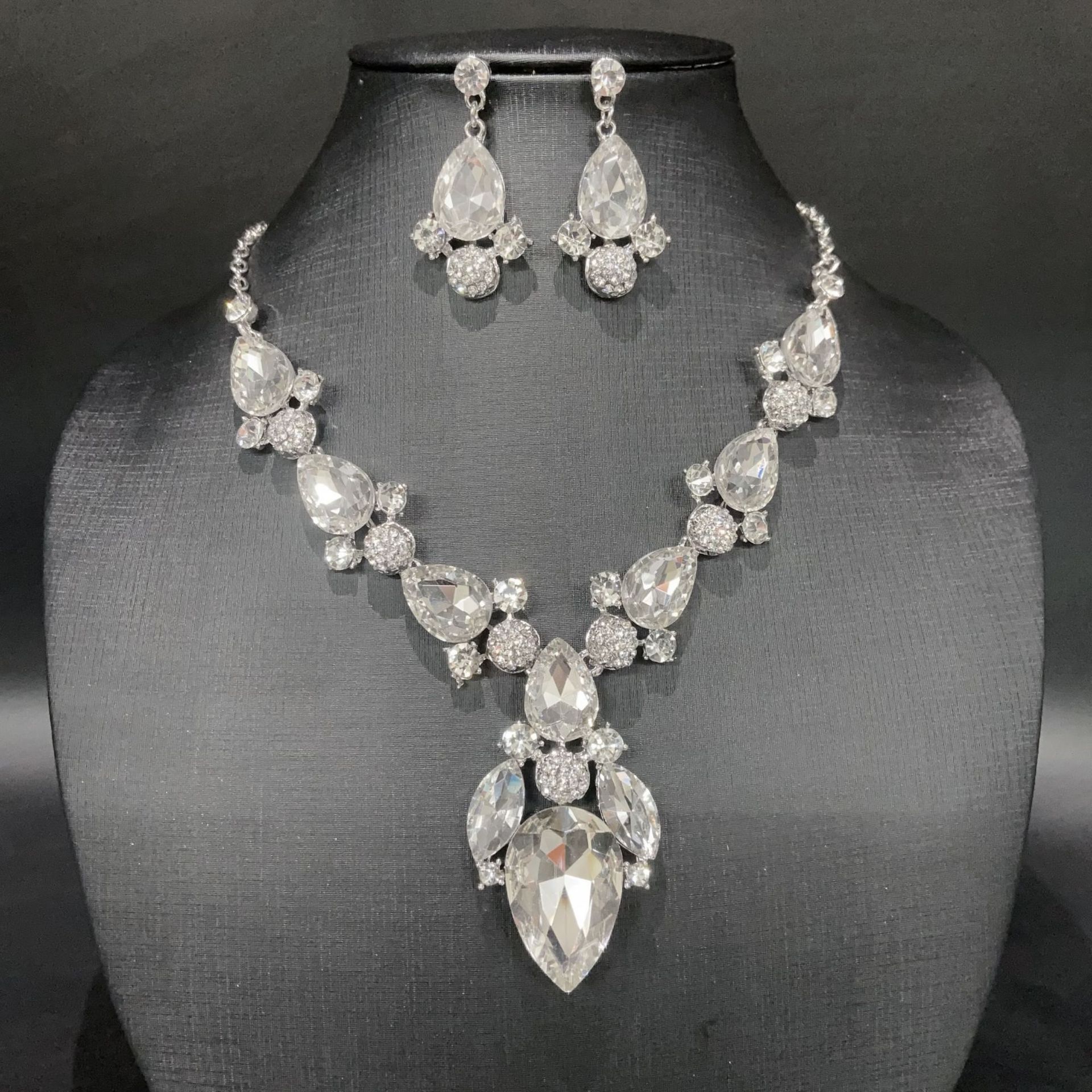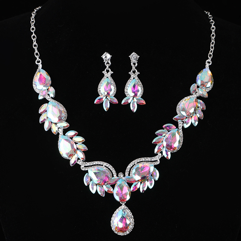 Amazon popular full diamond all-match water drop gem necklace earrings suit women's banquet dress bridal accessories
