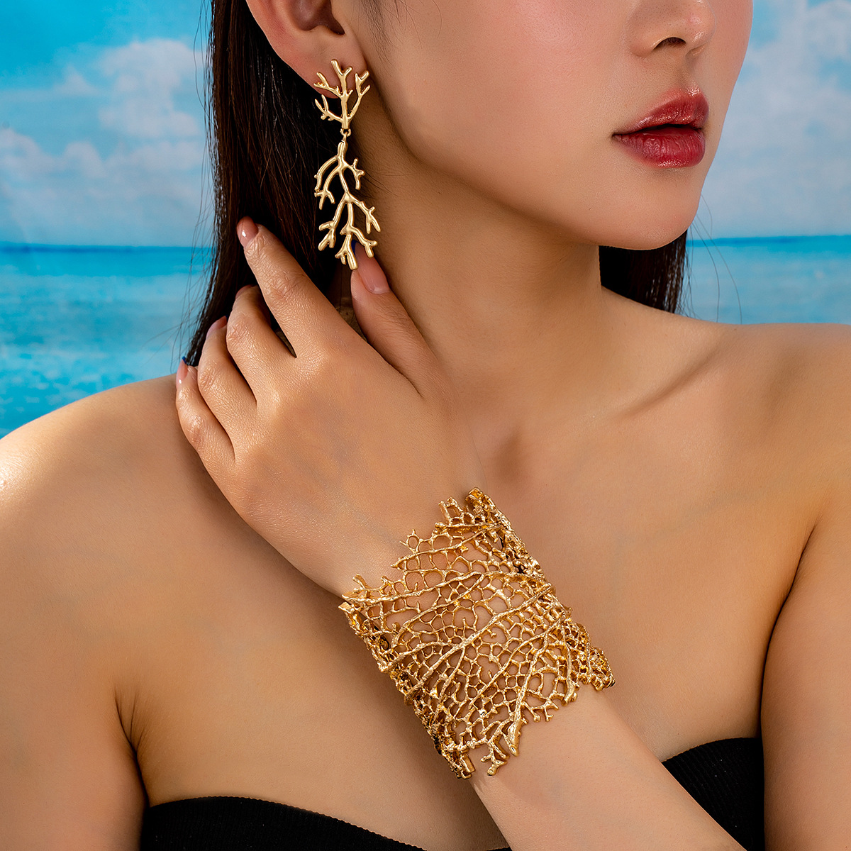 2025 new suit personality all-match European and American style fashion trend texture coral earrings open bracelet suit