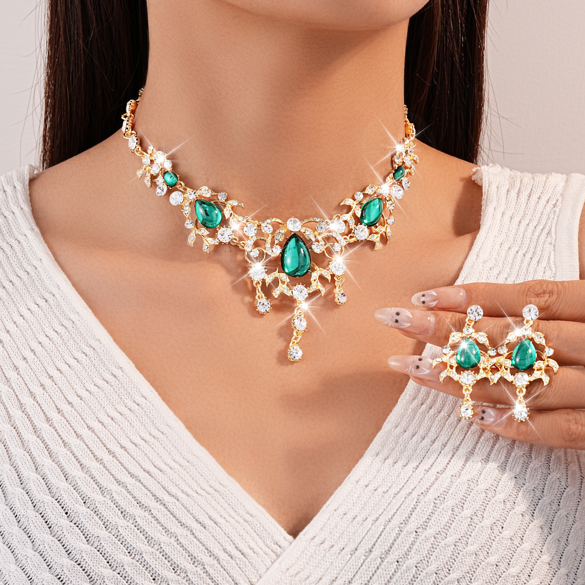 Cross-Border Leaf Diamond Water Drop Earrings Necklace Set Accessible Luxury High-End Clavicle Chain Medieval Vintage Jewelry