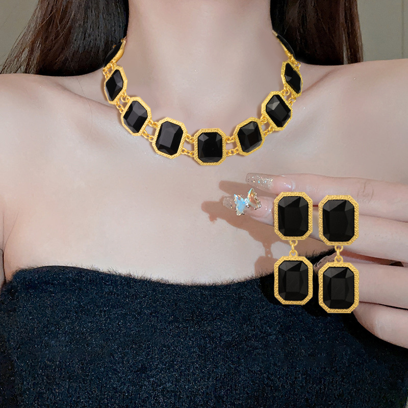 Heavy Industry Middle Ancient vintage Black Onyx Geometric Gem Necklace Retro Exaggerated Earrings suit High-end Jewelry