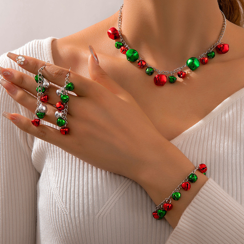 Christmas Series New Cute Red and Green Bells Beaded Earrings Necklace Bracelet Three-piece Cross-border Jewelry