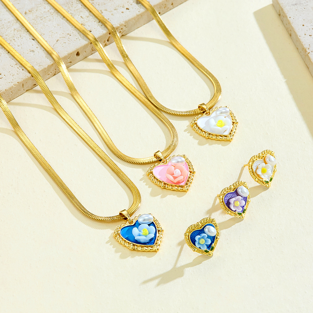 Chinese Style Painted Oil Painting Flowers Natural Imitation Pearl Oil Dripping Heart-Shaped Necklace Earrings Retro New Chinese Style Jewelry Set