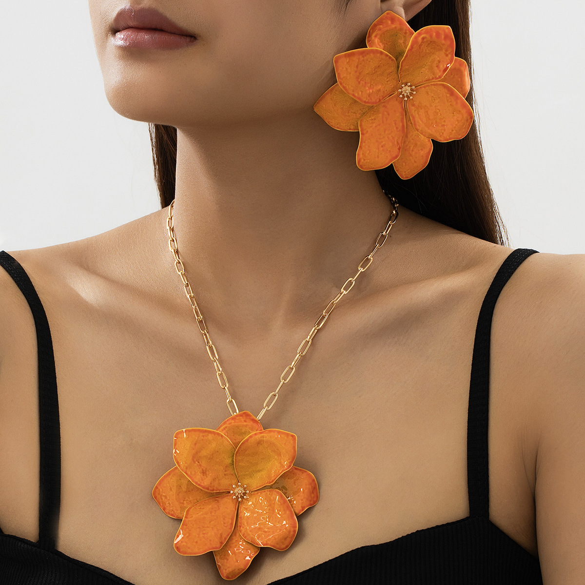 A Set of New Elegant and Fashionable Oil Spray Three-Dimensional Flower Pendant Necklace Earrings Women's Jewelry Set Holiday Gift