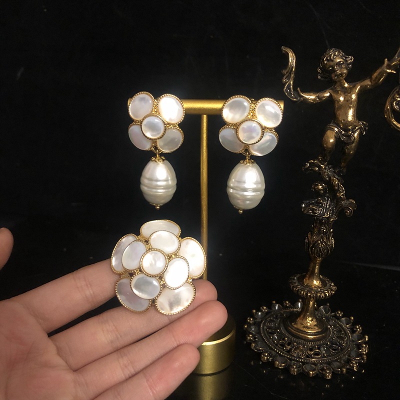 French Middle Ancient Jewelry Retro Mother-shell Three-dimensional Flower Shape Necklace Earrings Copper Ring suit Niche All-match Women