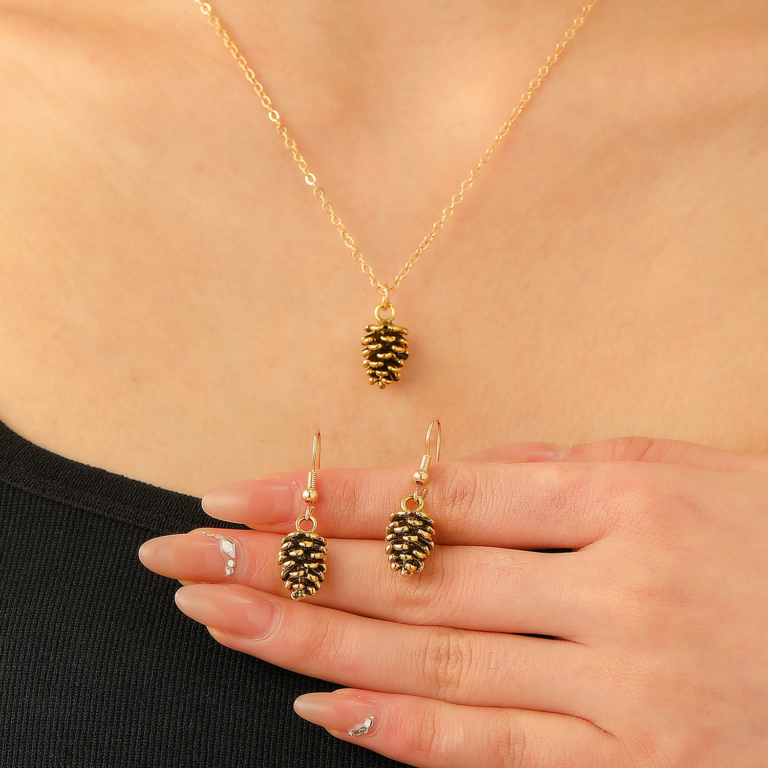 Ins Fashion Versatile Work Clothing Alloy Chain Pine Cone Pendant Clavicle Chain Fashion Earrings Necklace Set Decoration for Women