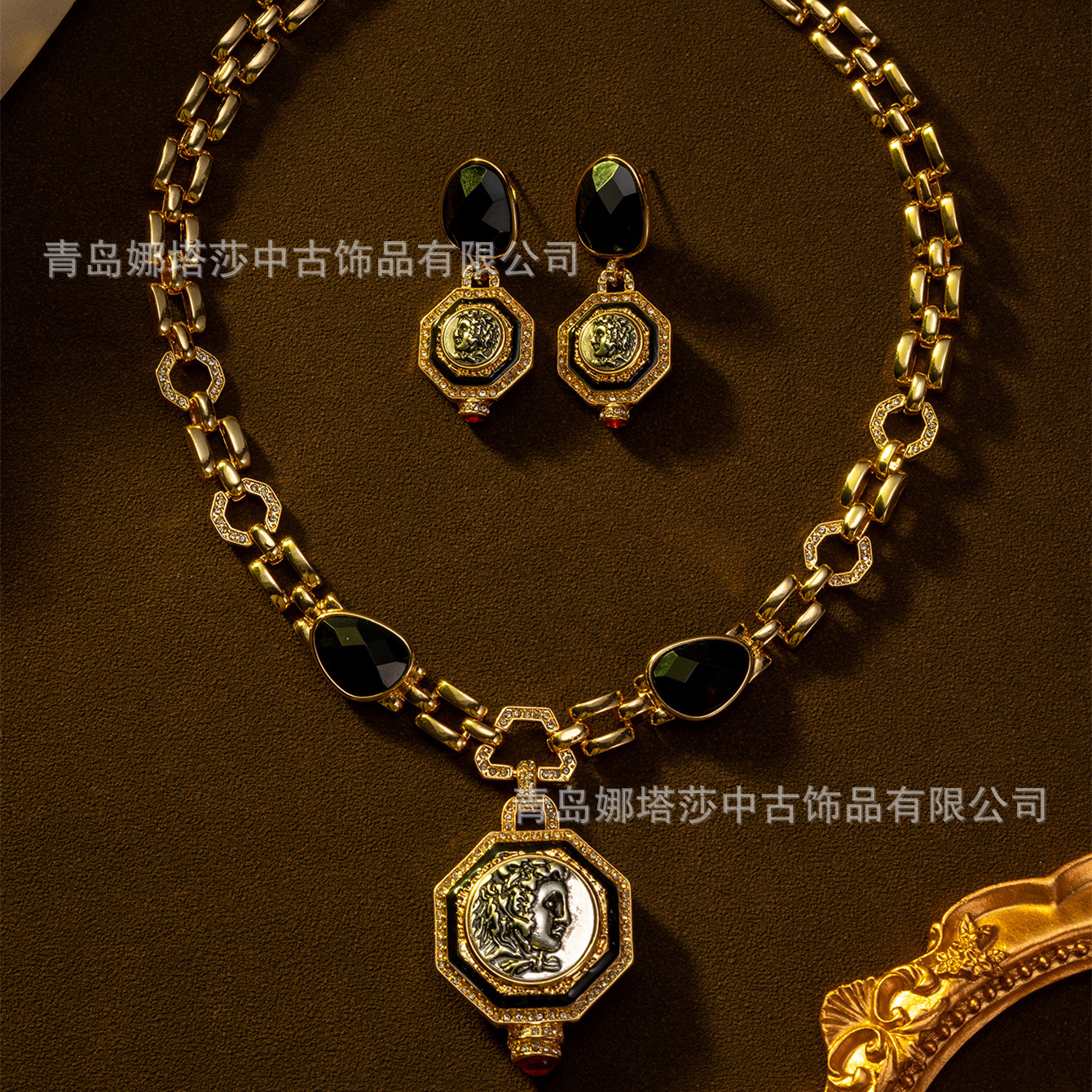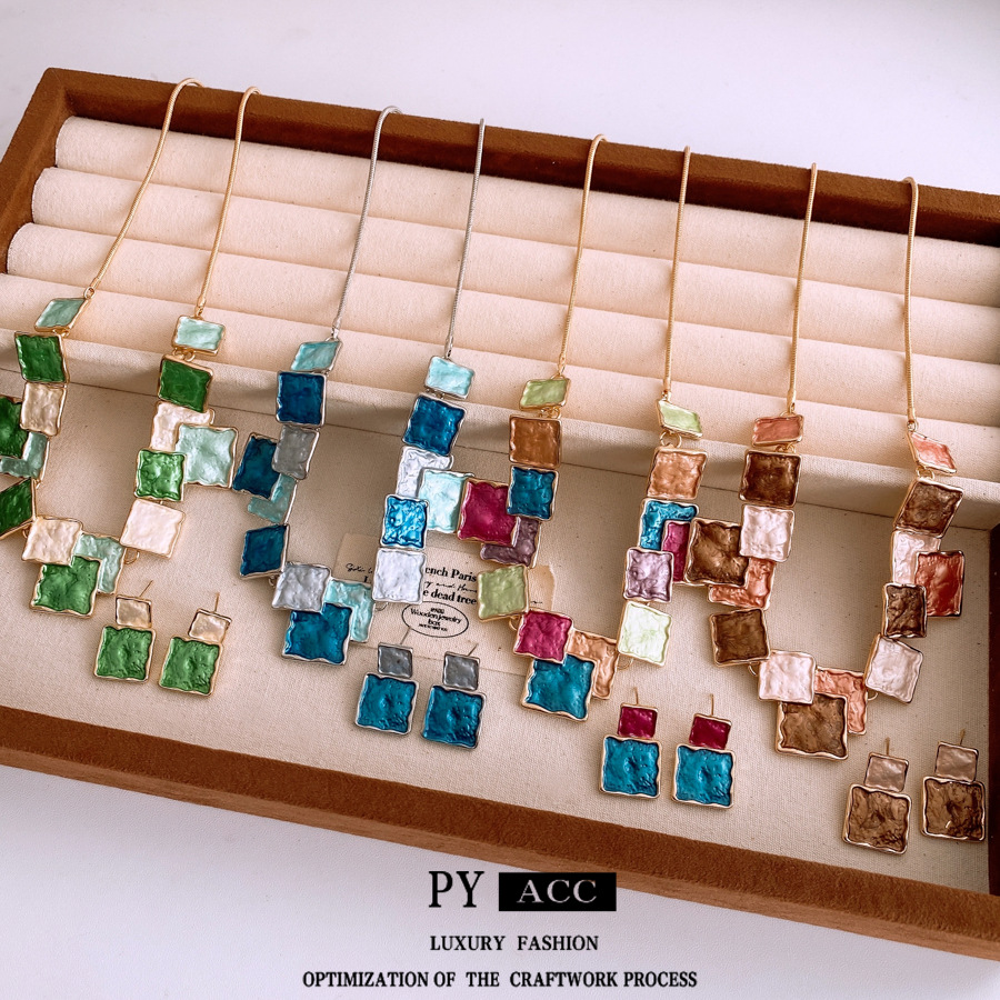 Medieval-Style Square Oil-Drip Pendant Earrings Necklace Simple Versatile Clavicle Chain Fashion Niche Jewelry Set Wholesale