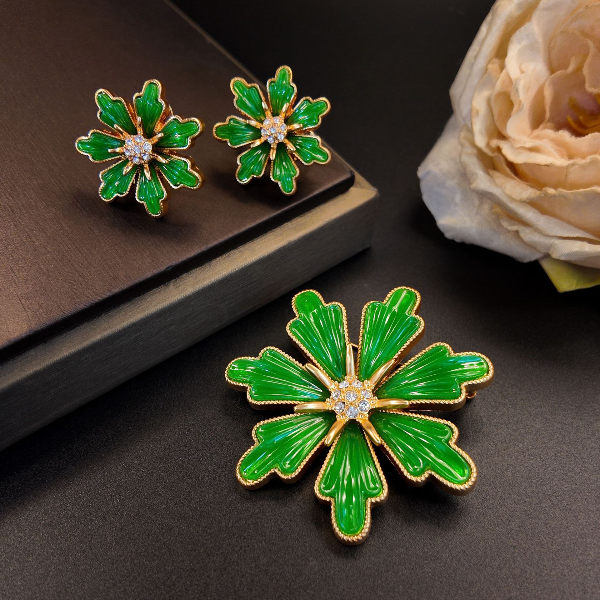 Three-dimensional green special-shaped petals flowers with diamond stamen earrings brooch jewelry suit vintage art jewelry wholesale