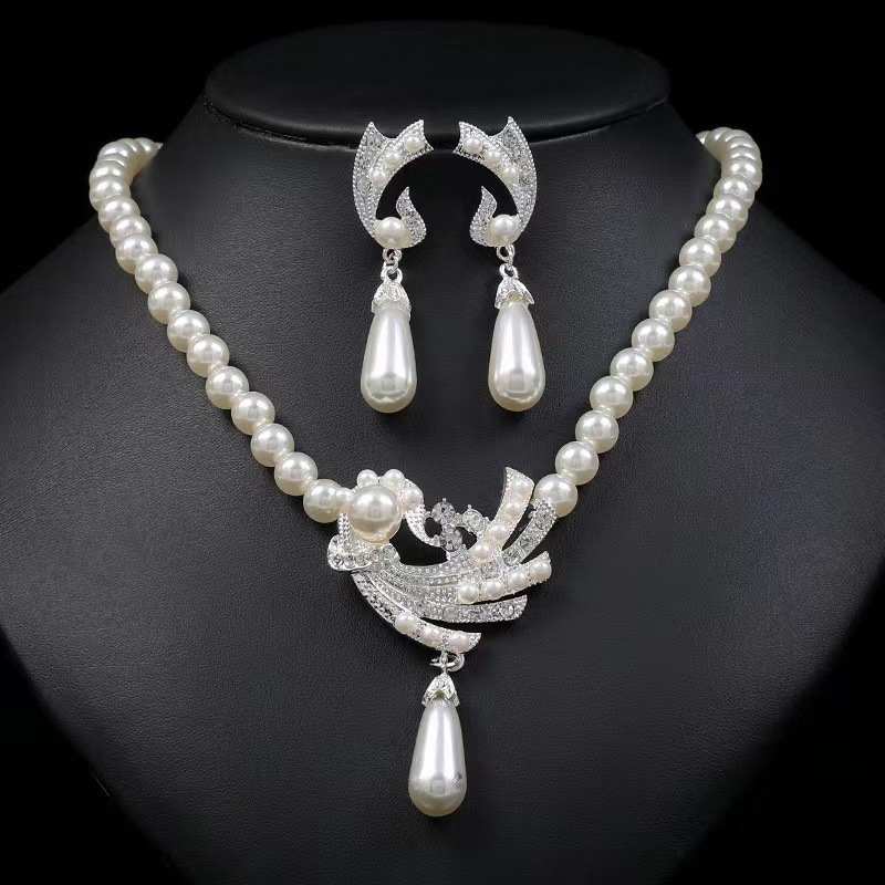 Korean Style Riot Pearl Necklace Earrings suit Bridal Dress All-match Accessories Fashion Novel Alloy Electric Two-piece Set