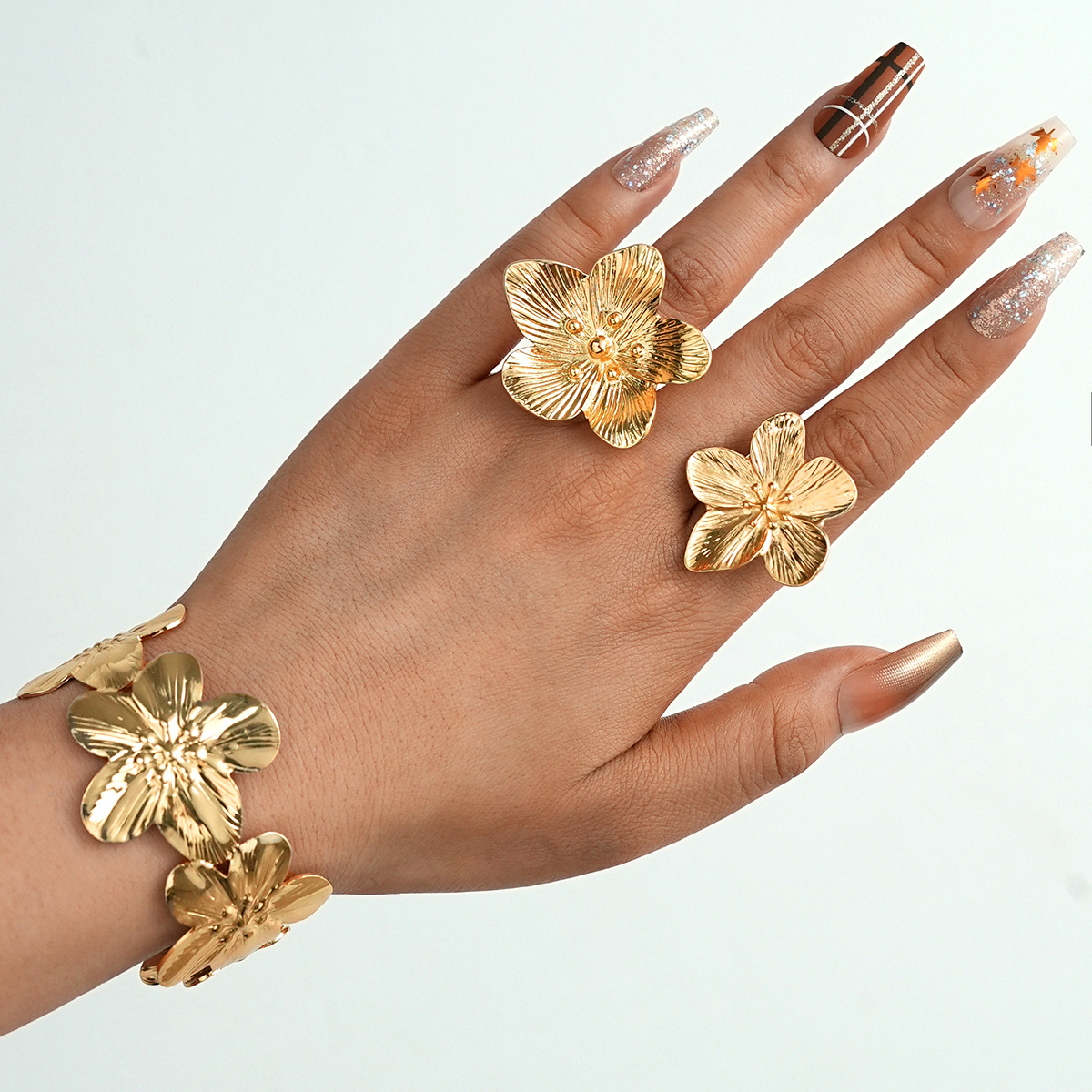 Gejia High-Quality V Gold Full Diamond Five-Pointed Star Earrings for Women, Fashionable Full Diamond Flower Open Ring, Accessible Luxury Style Necklace
