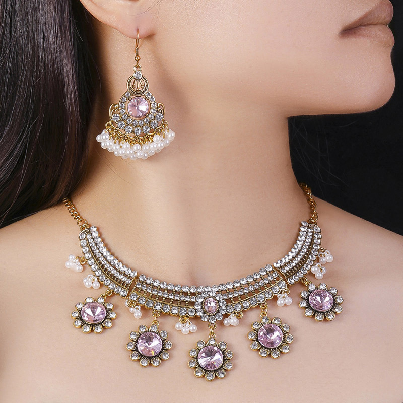 Fashion retro Middle East famous ethnic style flash Diamond small flower personality temperament female necklace earrings Daisy jewelry suit