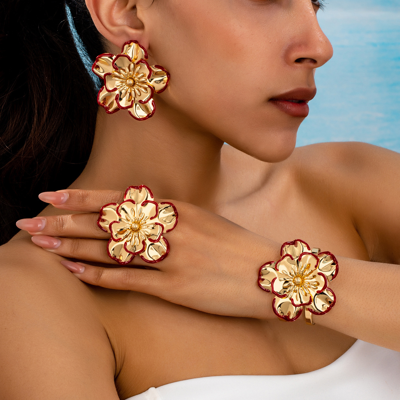 Niche Fashion High-end Sense Three-dimensional Glaze Camellia Earrings Women's Korean Style Elegant Street Beat Opening Ring Bracelet