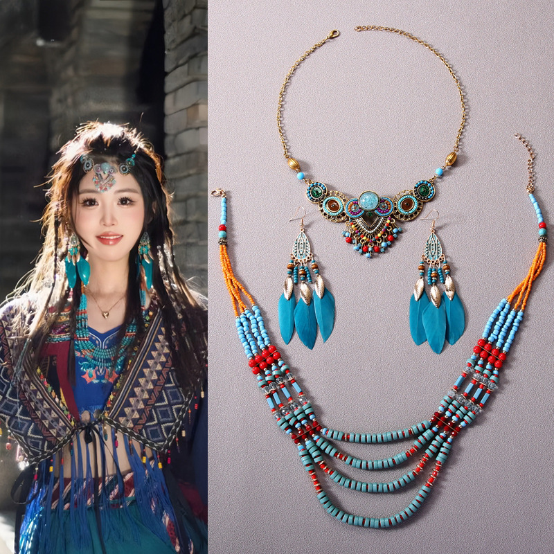 Three-piece Xizang ethnic style European and American retro tassel necklace earrings bracelet sweater chain clavicle chain suit