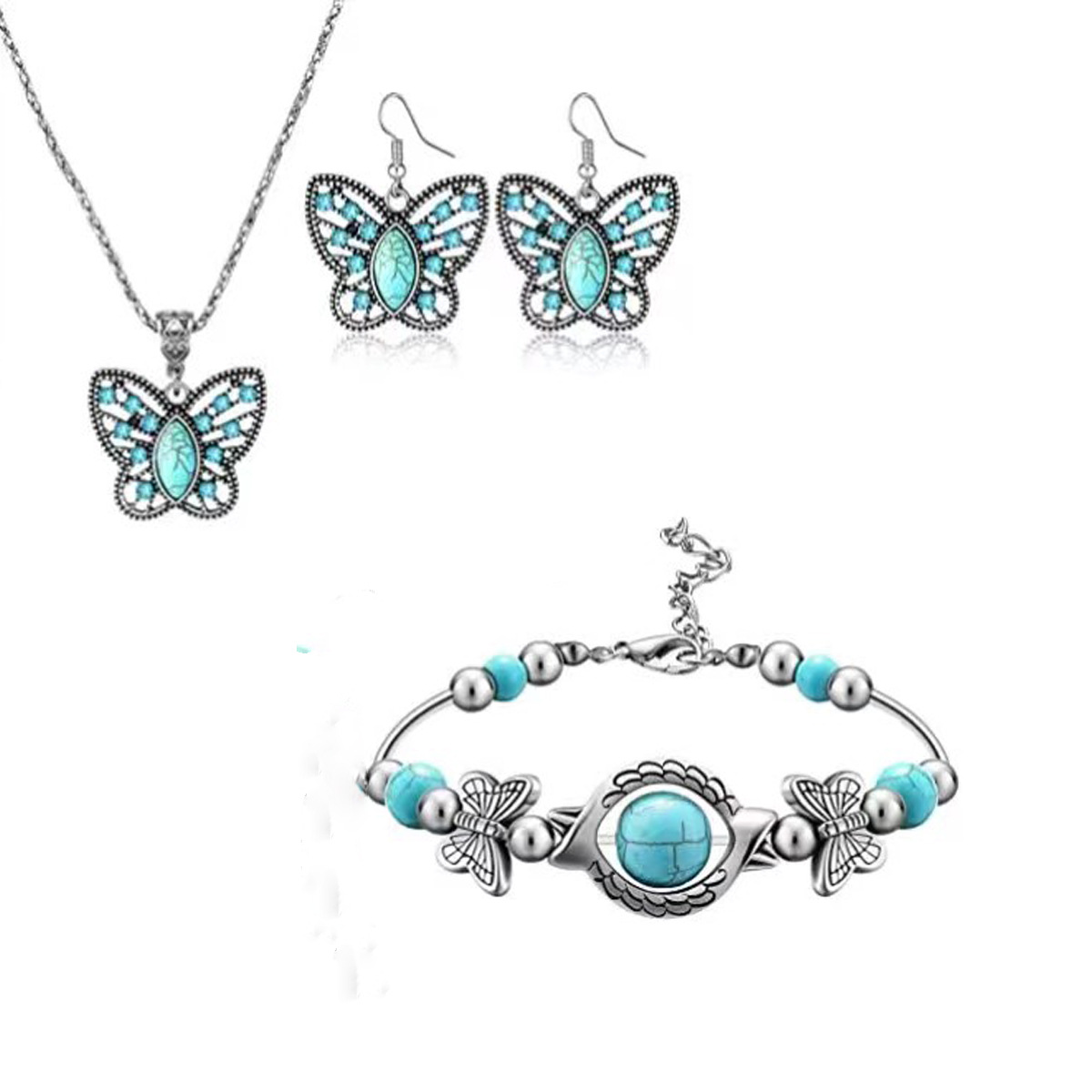 Cross-Border Amazon Xiyin Turquoise Butterfly Set Versatile Simple Turquoise Butterfly Earrings Pendant Bracelet Set