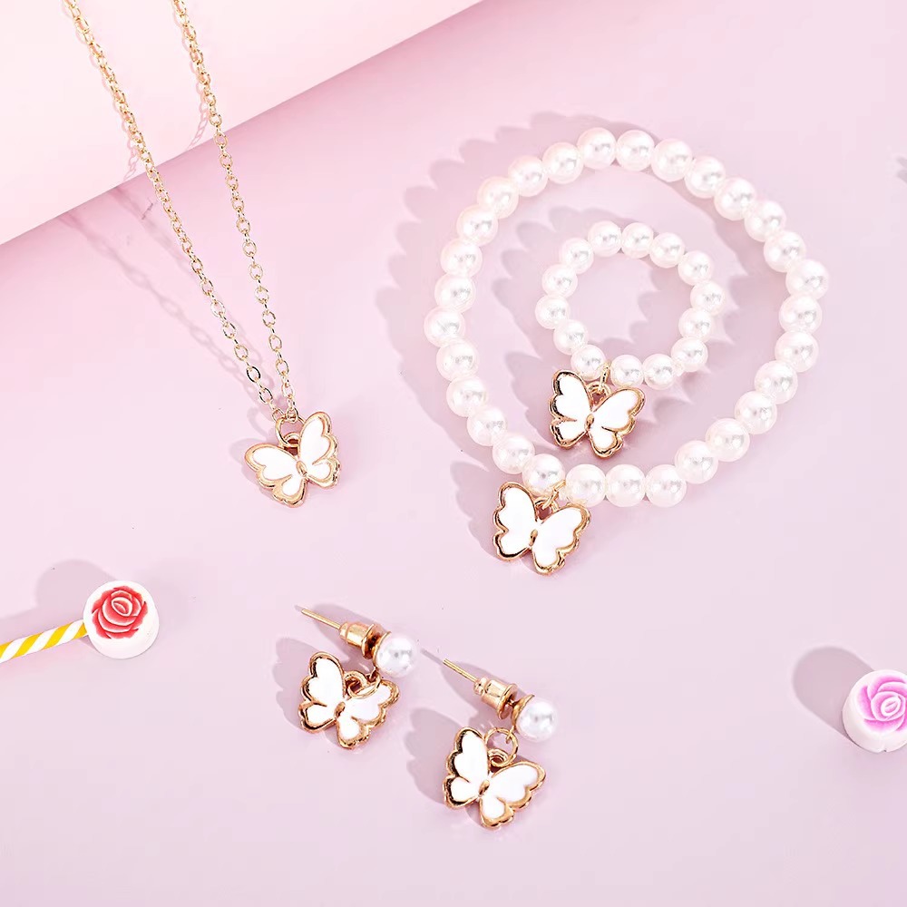 Cross-border Creative Butterfly Pearl Children's Necklace Ring Earrings Ring suit Cute Oil Dropping Women's Handset Gift