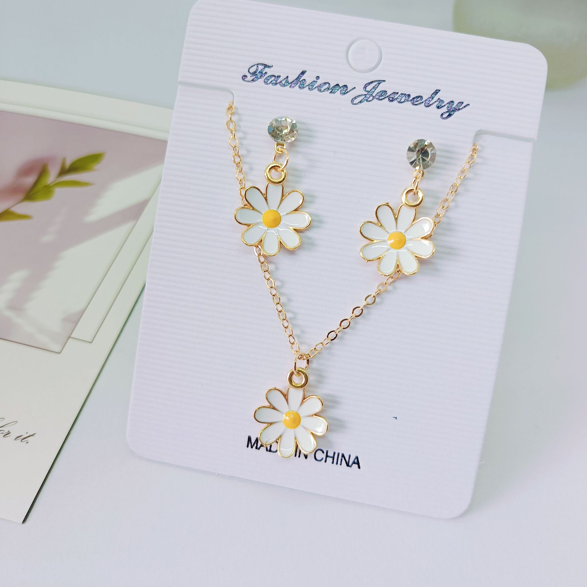 Daisy Earrings Necklace Set for Women Korean Style Niche Design Fresh and Sweet Pastoral Style Flower Oil Dripping Necklace