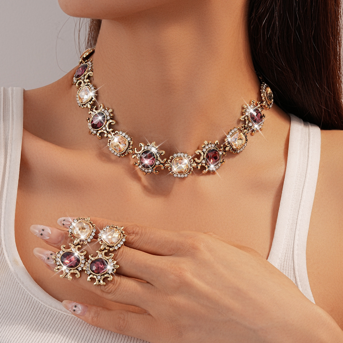 Medieval Vintage Necklace Square Leaf Diamond Clavicle Chain Retro Accessible Luxury High-End Elegant Jewelry Set