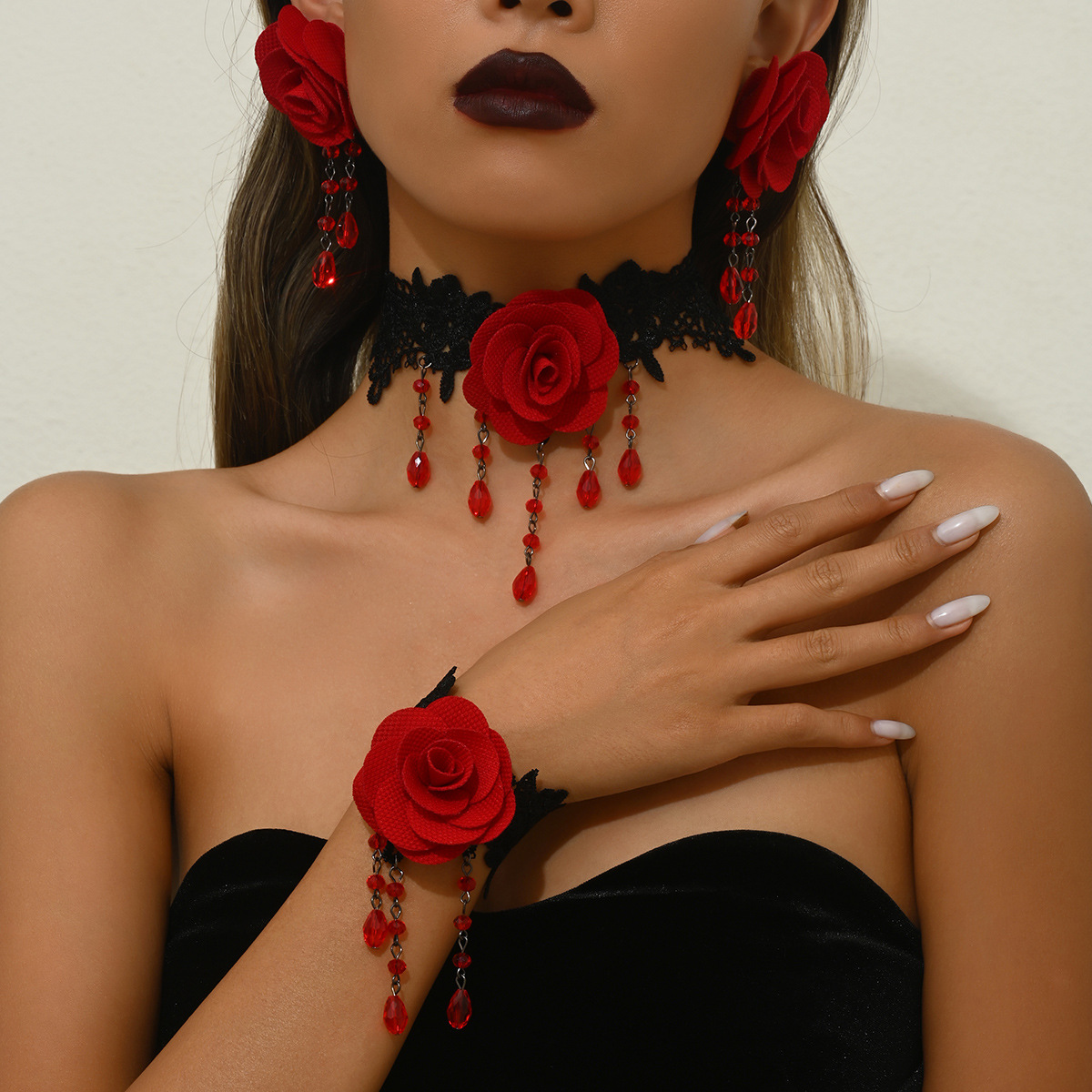 European and American Cross-border Gothic Ins Internet Celebrity Personalized Design Sense Tassel Lace Pendant Necklace Earrings Bracelet Combination