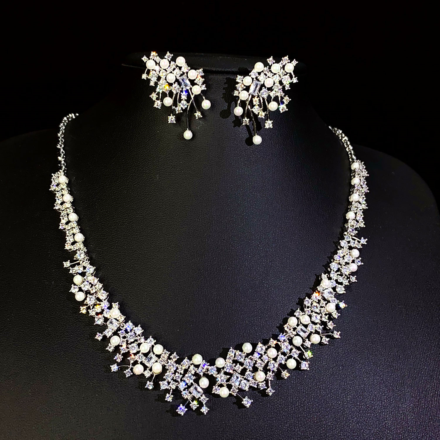 2024 New Arrival Brilliant Nebula Set Pearl Necklace Women's European and American Luxury Earrings Stitching Full Zirconium Bow Necklace