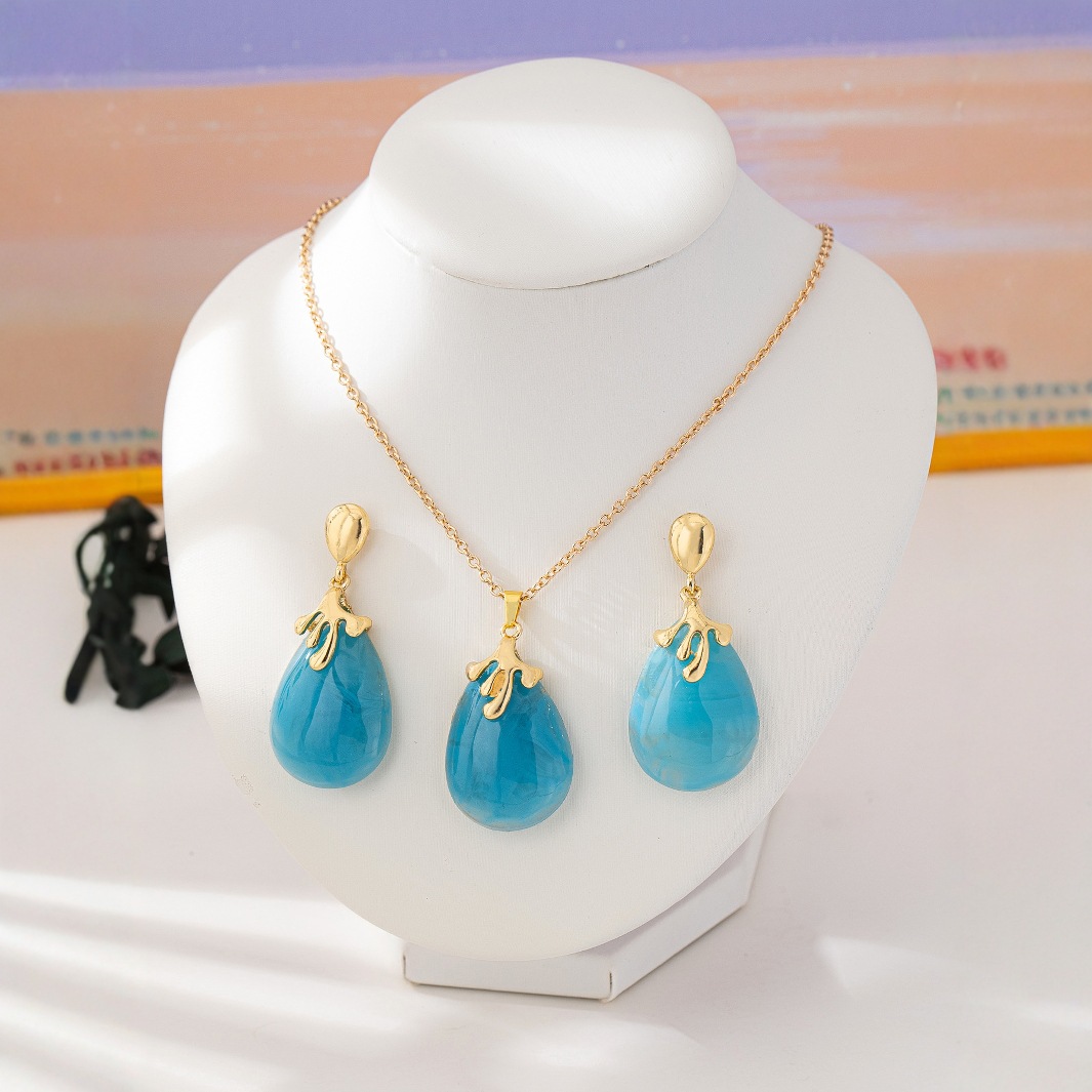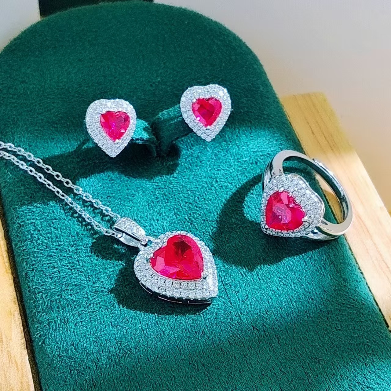 Live Broadcast Hot Selling Love Ruby Set Heart-Shaped Earrings Ring Pendant Necklace Jewelry Ocean Heart Three-Piece Set