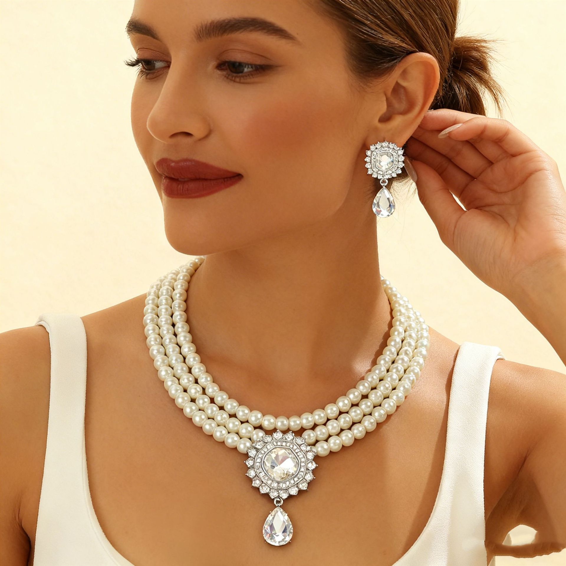 Cross-Border Supply European and American Versatile Pearl-Encrusted Diamond Clavicle Short Necklace Earrings Set Dress Bride Wedding Jewelry for Women