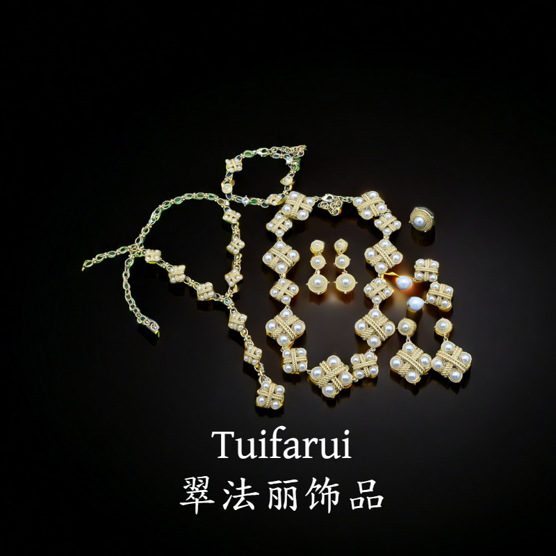 Middle ancient Vintage plating real gold heavy industry retro square temperament pearl jewelry suit