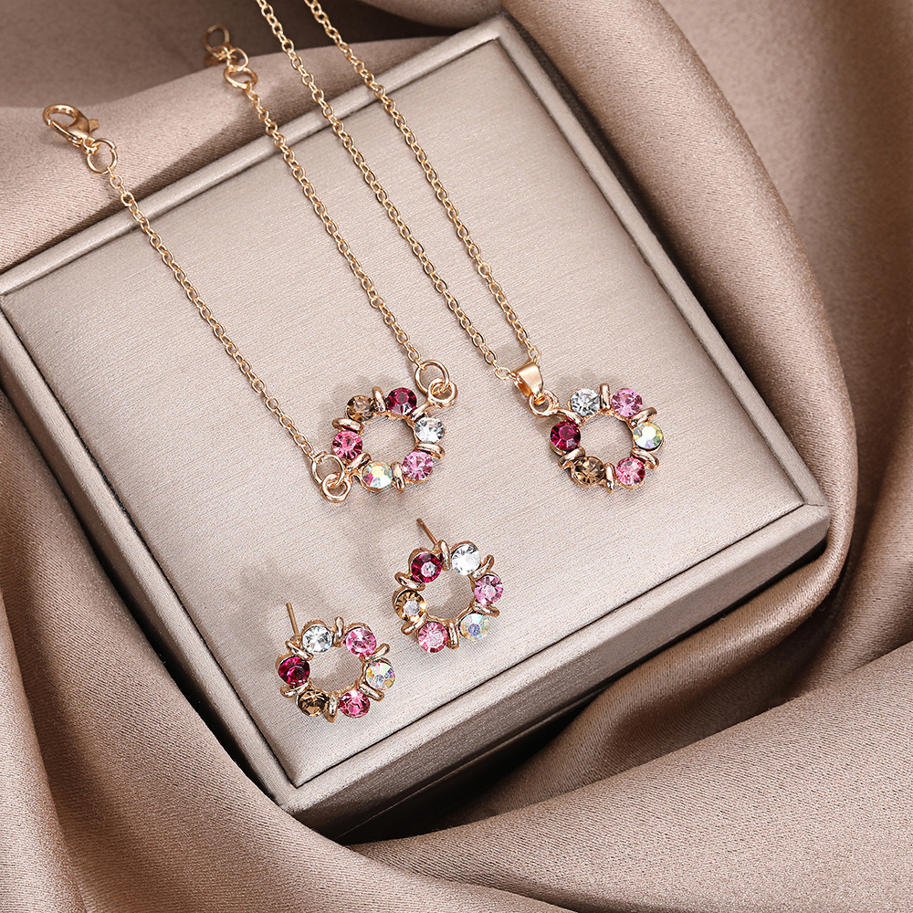 New European and American cross-border hollow diamond flower jewelry suit pink diamond bracelet earrings necklace women's jewelry wholesale