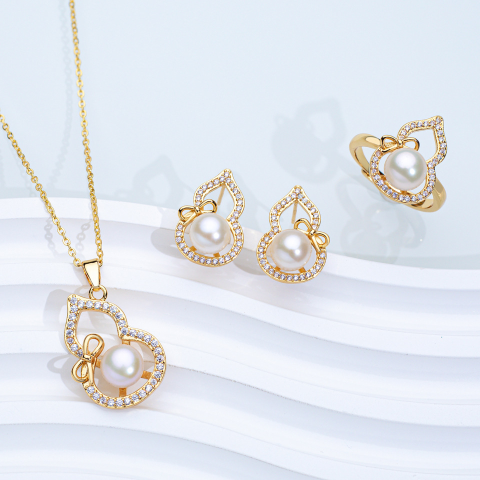 Gourd freshwater pearl three-piece set silver pin earrings ring pendant necklace high-end jewelry new wholesale