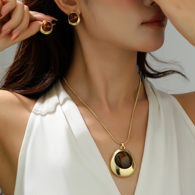 Cross-Border New Style Personalized Brown Resin Necklace Earrings Set Women's Autumn and Winter Fashion Retro Pendant Clavicle Chain Wholesale