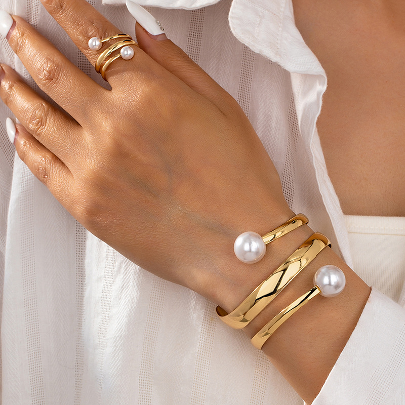 2025 European and American Creative Asymmetrical Line Imitation Pearl Open Bracelet Ring Niche Stylish Fashion Design Hand Jewelry