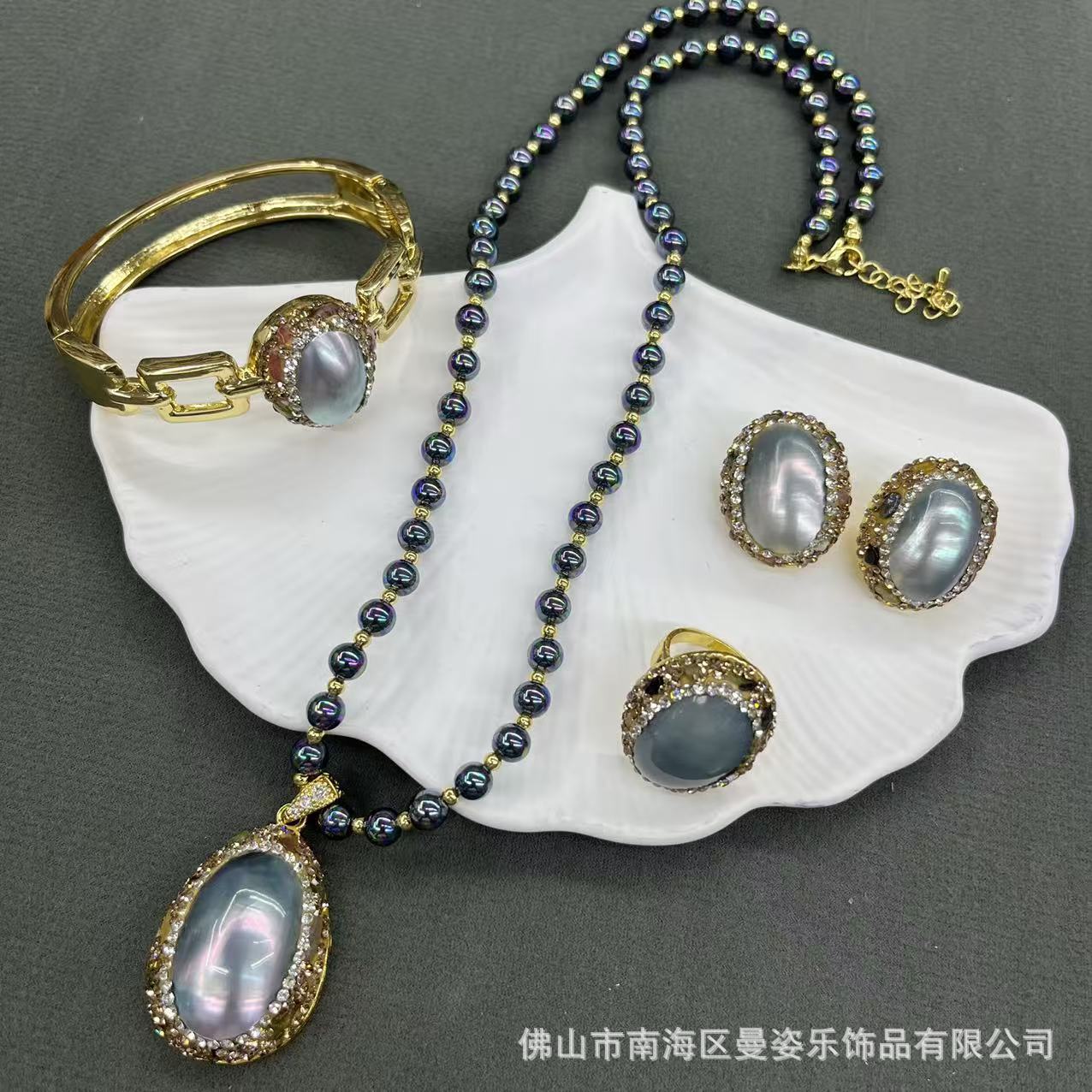 Europe and the United States cross-border hot jewelry fashion black ring necklace earrings black shine three-piece set manufacturers wholesale