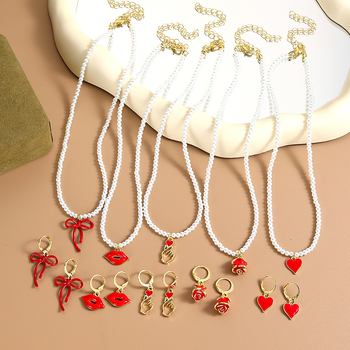 Cross-border Valentine's Day New Earrings Necklace suit Simple Bow Red Rose Love Pendant Beaded Necklace