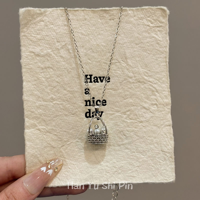 French New Style Fortune Basket Pearl Pendant Necklace Fashion Niche Creative Design Exquisite High-End Silver Needle Earrings
