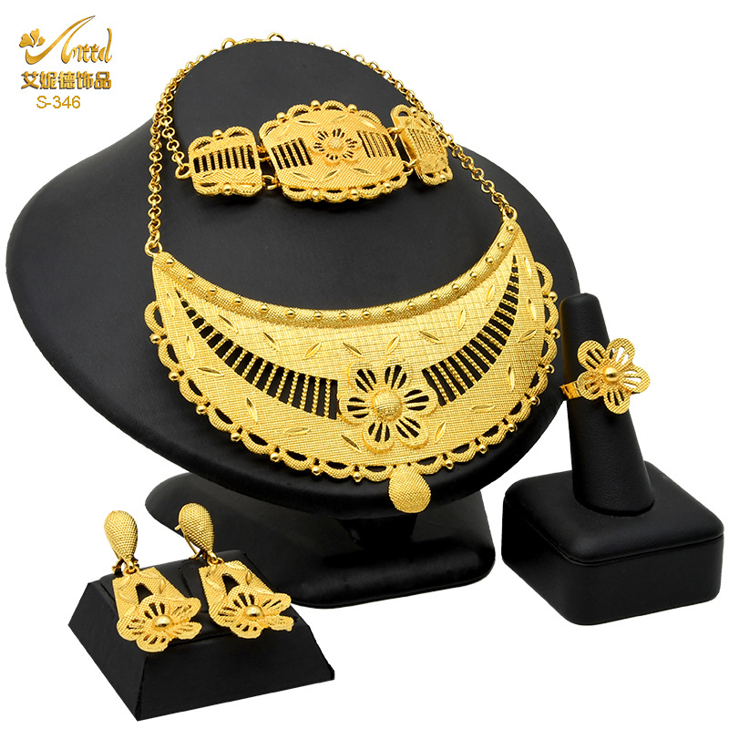 24K Gold Plated Arabic Women's Bridal Necklace Earrings Ring Bracelet Indian Women's Jewelry Set in Stock