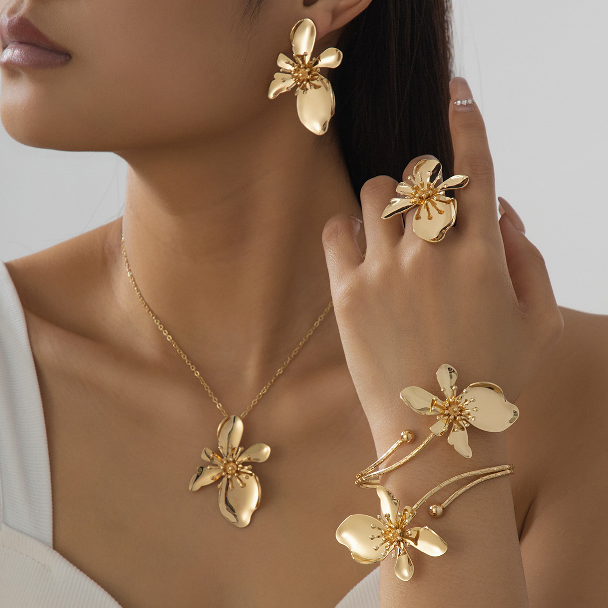 European and American Cross-Border Supply Fashion Personality Elegant Flower Earrings Necklace Ring Bracelet Jewelry Set Decoration Wholesale