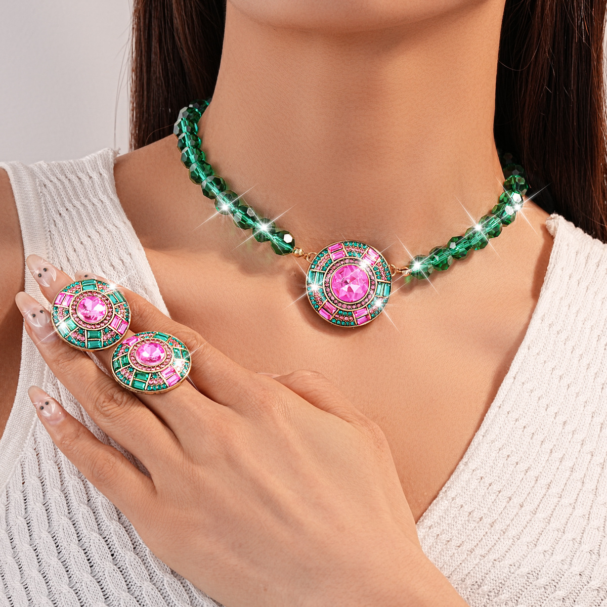 European and American Cross-Border Jewelry French Retro Gemstone Pendant Necklace Versatile Geometric Round Lock Women's Bone Chain Earrings