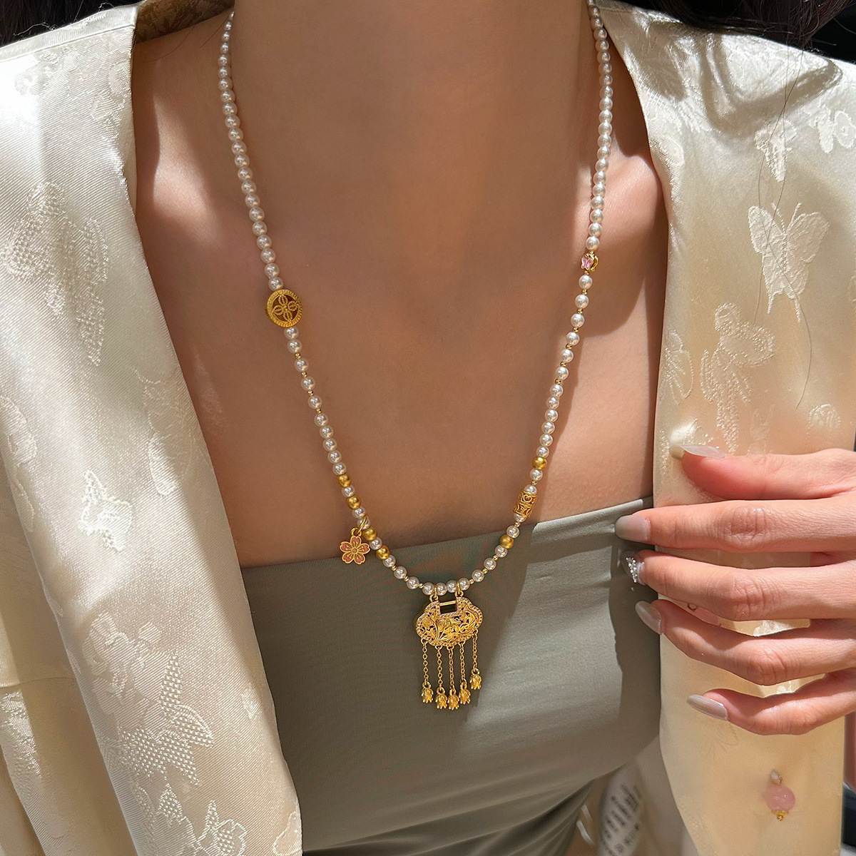 Sesselian Lotus Ruyi Lock Eight Treasures Compasses Shackin New Chinese Style Shijia Pearl Necklace 2025 New Women